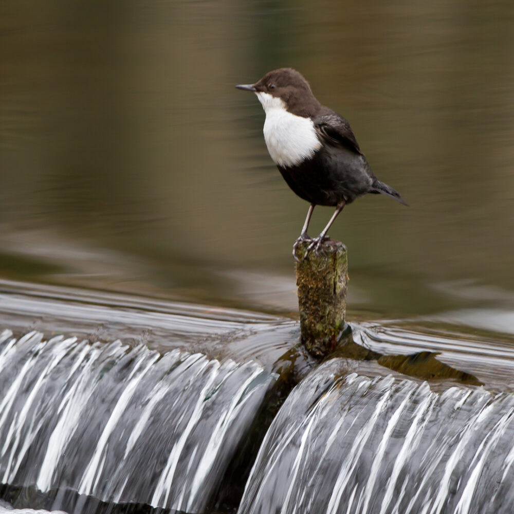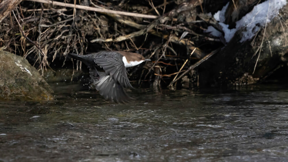 Waterspreeuw (Cinclus cinclus) en dan de alpen ondersoort aquaticus (Bruinbuikversie). Meest standvogel, soms in Nederland. De Noordelijke soorten hebben die bruine band niet. Geleidelijke overgangen komen voor. Broedt langs ondiepe, snelstromende wateren. Duikt onder water om het voedsel te zoeken en loopt op de bodem. Kleine staartje omhoog en die drukt hem naar beneden. Ook de vleugels gebruikt hij/zij. Aan de Gail rivier in Oostenrijk, nabij Rattendorf.