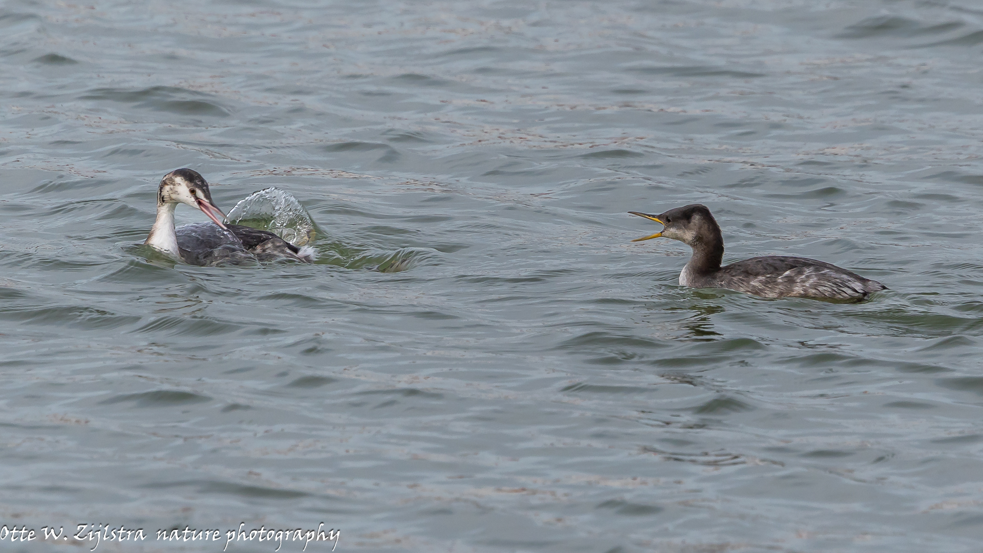 Vorige week op doorreis naar Drenthe even een stop gemaakt bij Den Oever; daar zou een Roodhalsfuut moeten zitten. En die vond ik weer terug. Eerst dobberde hij wat veraf, maar hij/zij kwam dichterbij en begon te duiken. kennelijk zat daar vis want er ging ook een Fuut (alles in winterkleed) naar toe. Dan verwacht je een confrontatie en ondanks dat de (gewone) Fuut gemiddeld iets groter is, had hij toch wel respect voor zijn neef die met enkele tientallen exemplaren bij ons overwinterd, liefst op zout water. Je kunt nu de kenmerken mooi vergelijken; opvallend de gele snavel bij de Roodhalsfuut.