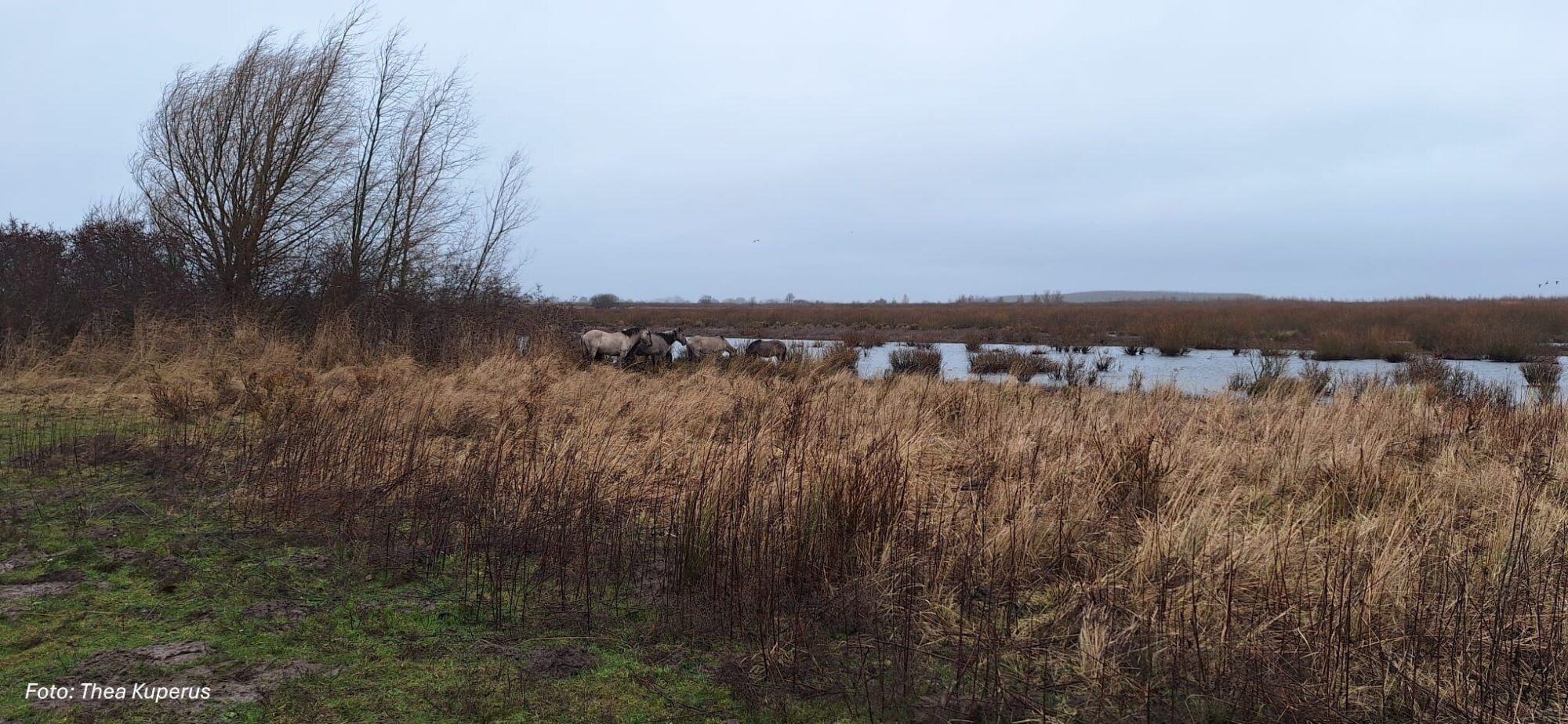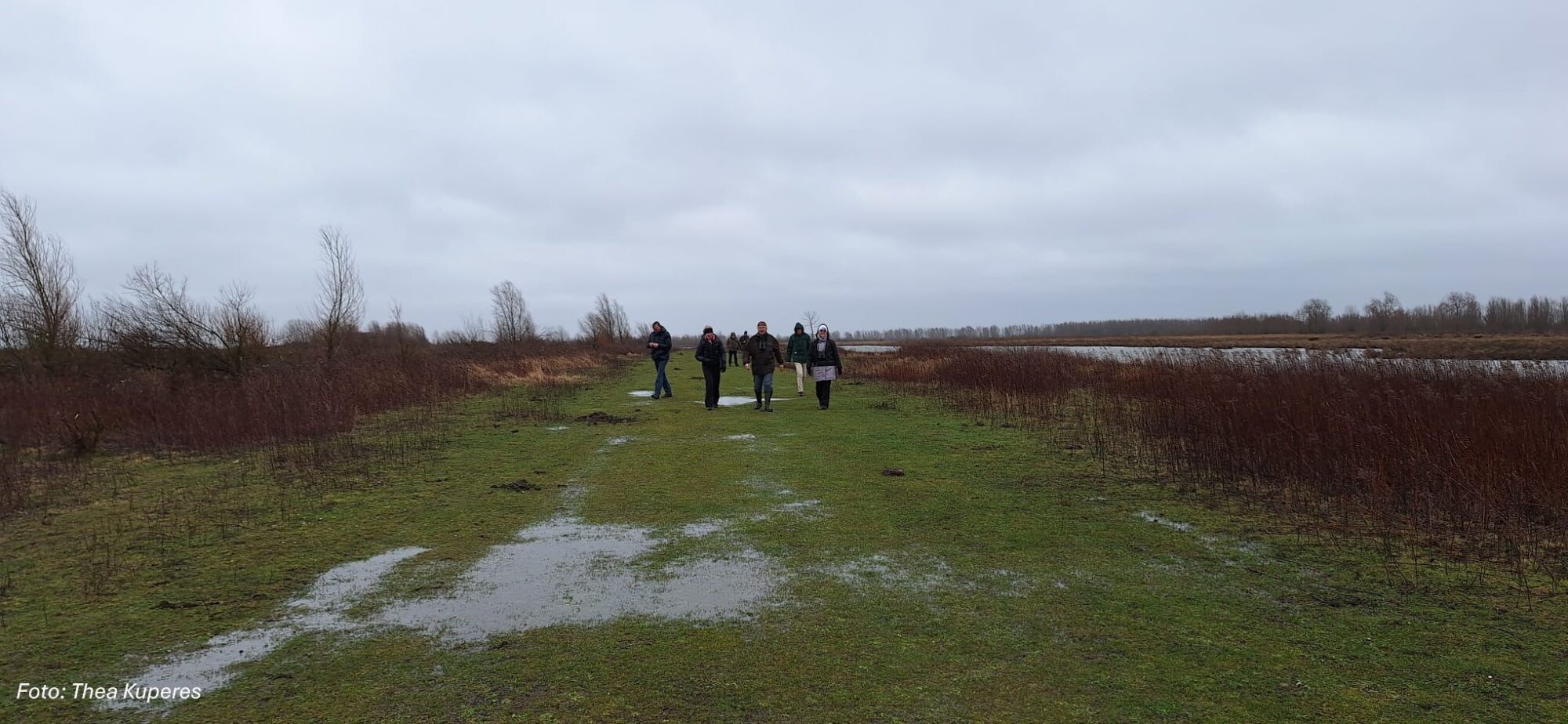 Het is 22 februari en om half 8 vertrekt in de stromende regen een groep enthousiaste Tringa-vogelaars richting Tiengemeten. We gaan met de pont over. Op stap met een gids van Natuurmonumenten, die van alles over het eiland vertelt, zoals over de vroegere eigenaren, de bewoning, de agrarische achtergrond en de watersnoodramp. En uiteraard over de vogels, de bevers, de reeën en de vos. Er staat een harde wind en het regent van tijd tot tijd flink, maar dat mag de pret niet drukken. We zien de rosse stekelstaart, nonnetjes en veel andere eenden. Over de rietlanden cirkelen enkele bruine kiekendieven. Ook de buizerd en torenvalk zijn van de partij. Achter wat bosjes trotseren dappere konikspaarden met de bips naar de wind gericht de regenvlagen. We lopen nu over een drassig graspad en de achterblijvers worden getrakteerd op een laag over het riet vliegende blauwe kiekendief.